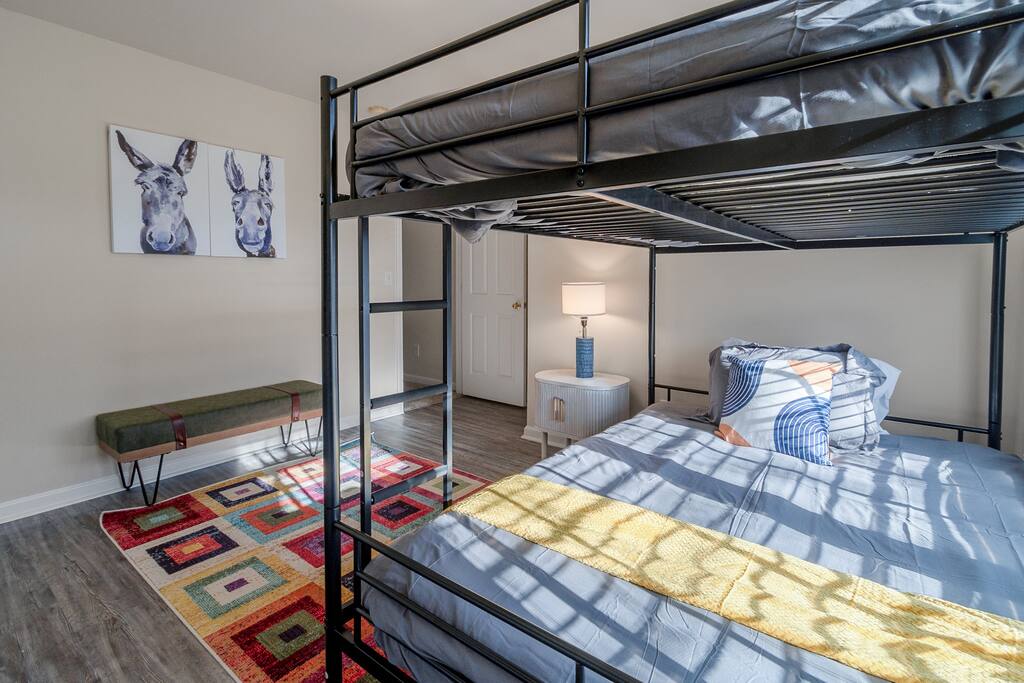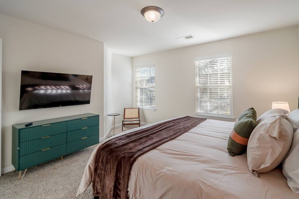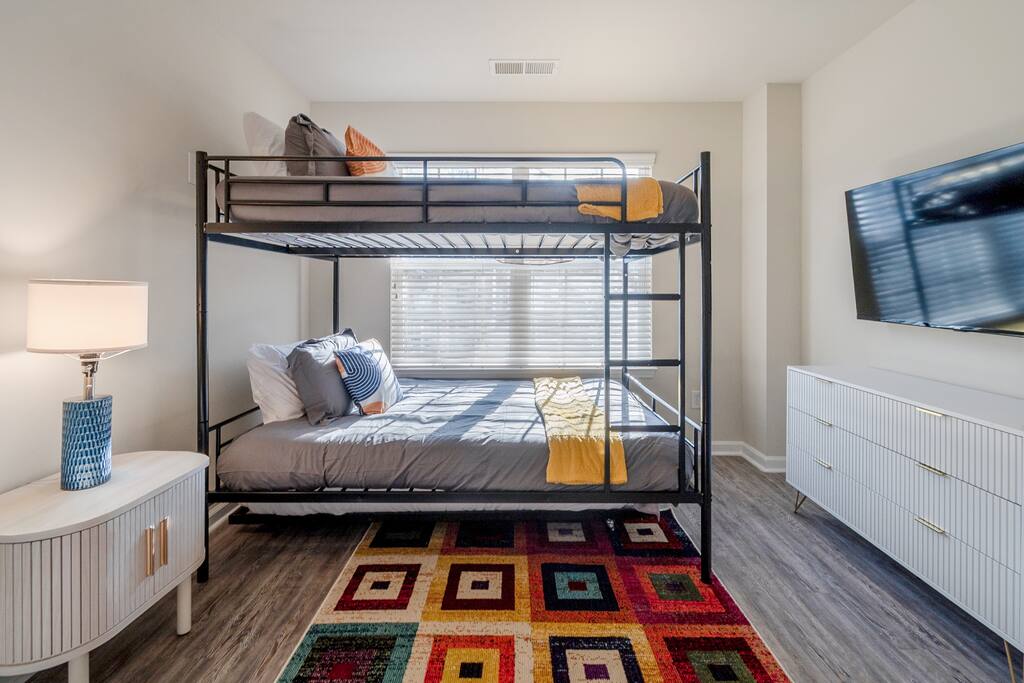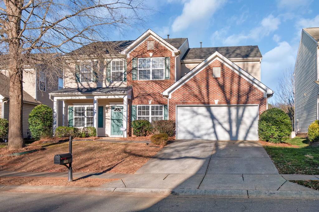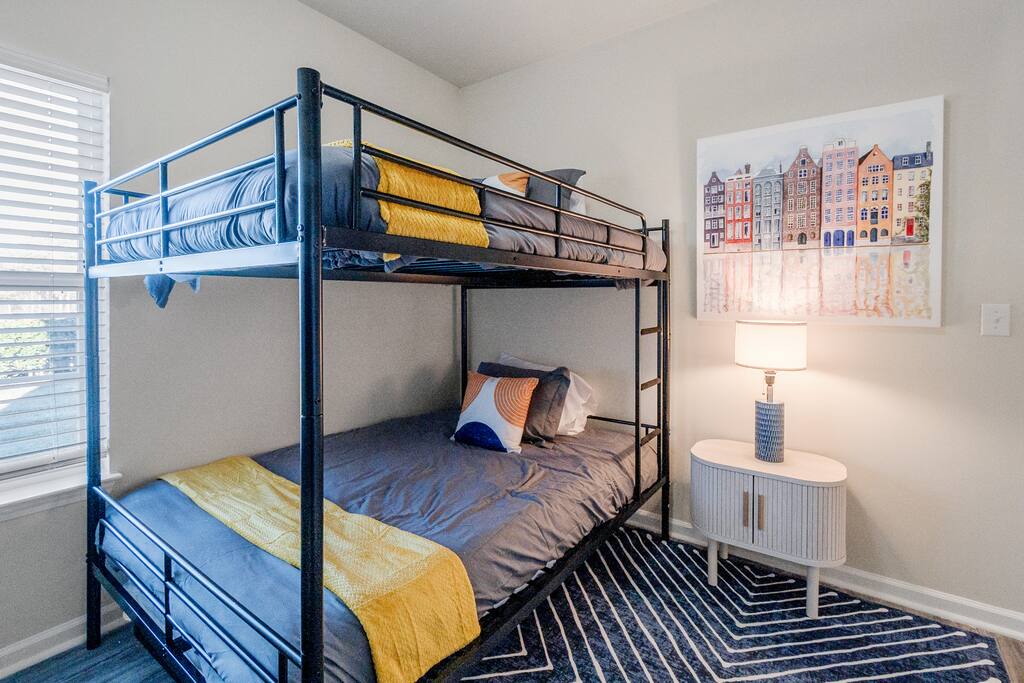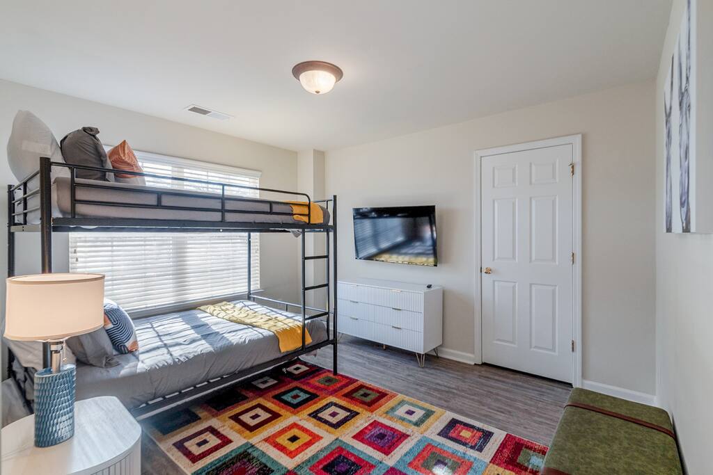 FAMILY ROOM: The Cozy Gathering Hub ✔ Gas fireplace for cozy nights in ✔ Board games for family fun & rainy days ✔ Plenty of seating + lounge chairs for group hangouts ✔ Large coffee table + side tables for snacks, drinks & laptop work ✔ Perfect for meals, game nights, or relaxing with the fire SUNROOM: Bright, Relaxing, & Versatile ✔ Surrounded by natural light ✔ Ideal for morning coffee, reading, remote work, or quiet calls ✔ Comfortable seating for small groups ✔ A favorite space for kids, grandparents, and early risers DINING ROOM: Group Meals & Celebrations ✔ Seats 8 guests comfortably with room to add extra chairs ✔ Ideal for family dinners, holiday meals, or team takeout nights ✔ Centrally located near the kitchen & living spaces ✔ Great for board games, puzzles, or work sessions when not in use for meals LIVING/MEDIA ROOM: Movies, Sports & Relaxation ✔ 65″ Smart TV for streaming movies, sports & shows ✔ Corner reading nook for quiet time or page-turners ✔ Cozy seating ideal for movie nights or binge-watching ✔ Great second living space for guests to spread out PRIMARY BEDROOM: Spacious King Suite ✔ King bed with premium linens ✔ Dedicated workspace for calls, laptops, & productivity ✔ Corner reading nook with natural light ✔ 50” Smart TV for streaming ✔ En suite bathroom featuring: - Walk-in shower - Whirlpool bathtub - Dual vanities - Walk-in closet SECOND BEDROOM: King + Reading Nook ✔ King bed ✔ Reading nook for relaxing wind-down time ✔ 50” Smart TV ✔ Generous storage & natural light THIRD BEDROOM: Bright King Room ✔ King bed ✔ 50” Smart TV ✔ Plenty of natural light (morning light is lovely here) FOURTH BEDROOM: Bunk Room w/ Personality ✔ Full-over-Full bunk bed + Twin trundle ✔ 50” Smart TV ✔ Quirky, playful decor ✔ Ideal for kids, cousins, siblings, or friend groups FIFTH BEDROOM: Flexible Bunk Space ✔ Full-over-Full bunk bed + Twin trundle ✔ 50” Smart TV ✔ Storage for longer stays BATHROOMS: Clean, Stocked & Functional ✔ 2.5 total bathrooms, including the primary ensuite ✔ Full hallway bathroom with shower/tub combo ✔ Main floor half bath for convenience ✔ Stocked with shampoo, conditioner & body wash ✔ Microfiber towels provided for every guest ✔ Hair dryer included KITCHEN & DINING ✔ Fully equipped kitchen (cookware, utensils, dinnerware) ✔ Nespresso machine w/ pods ✔ Air fryer, toaster, electric kettle ✔ Stainless appliances, nonstick pots and pans ✔ Dining table for groups ✔ Counter seating for casual meals TECH & CONNECTIVITY ✔ High-speed Wi-Fi (500Mbps+) ✔ Smart TVs in every bedroom + main living room ✔ Self check-in via smart lock OUTDOOR FEATURES ✔ Fenced backyard (private & secure) ✔ Picnic table for outdoor dining ✔ Perfect for kids, pets, and group hangouts LAUNDRY / PARKING ✔ Washer & dryer (detergent + dryer sheets provided) ✔ Free parking for up to 4 cars (garage + driveway) ✔ No overnight street parking allowed - HOA enforced; fines possible PETS ✔ Up to 2 dogs allowed ✔ $100 pet fee per stay ✔ Dogs must be house-trained, leashed outdoors, & not left unattended unless crated ✔ Guests must clean up after pets; damage/excess cleaning may incur charges IDEAL FOR ✔ Family trips & reunions ✔ Business & consulting travel ✔ Insurance displacement & ALE stays ✔ Relocations & extended stays ✔ Medical visits (Atrium / CaroMont nearby) LOCATION HIGHLIGHTS ✔ 5 min to Charlotte Premium Outlets (100+ stores) ✔ 9 min to Topgolf Charlotte Southwest ✔ 10 min to CLT Airport ✔ 15 min to Whitewater Center ✔ Near Lake Wylie, parks & trails ✔ Near dining, groceries, coffee & gyms ✔ Quick access to I-485 & I-77 NEARBY DINING & COFFEE ✔ Jim ’N Nick’s Bar-B-Q ✔ Enrico’s Ristorante & Pizzeria ✔ Steele Creek Cafe ✔ Starbucks / Dunkin’ ✔ Chick-fil-A / Panera / Chipotle NEARBY GROCERY & ESSENTIALS ✔ Publix ✔ Harris Teeter ✔ Walmart Supercenter ✔ Target HOUSE RULES & IMPORTANT NOTES ★ PETS ★ - Up to 2 dogs allowed - $100 pet fee per stay - Dogs must be leashed outdoors and not left unattended unless crated - Guest cleanup required; damage/excess cleaning may incur charges ★ NO SMOKING INSIDE ★ Smoking indoors is strictly prohibited. Evidence will result in odor & cleaning fees. ★ GATHERINGS & QUIET HOURS ★ - No parties or large events - Small gatherings are allowed (within guest count) - Must respect neighbors and home - Quiet hours: 10PM–8AM ★ PARKING & HOA RULES ★ - Driveway + garage parking for up to 4 vehicles - No overnight street parking (HOA enforced, fines possible) ★ SECURITY & SAFETY ★ - Smoke & CO detectors - Fire extinguisher & first-aid kit - Ring doorbell + exterior security cameras (entry-only; no interior)