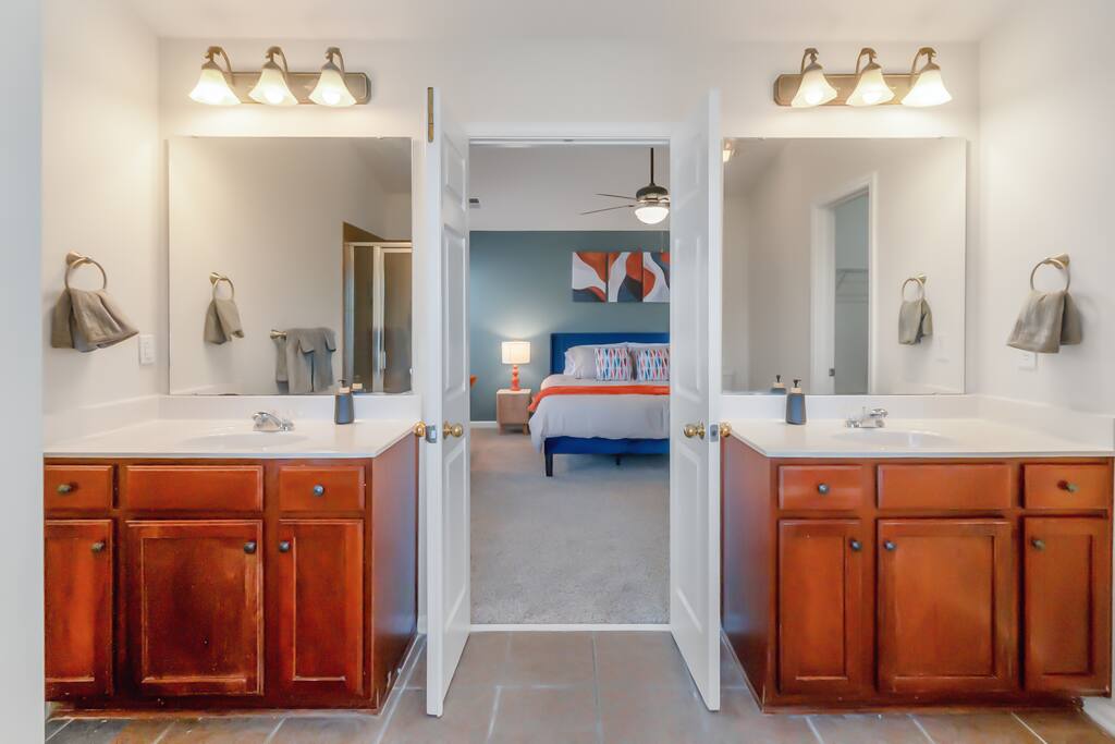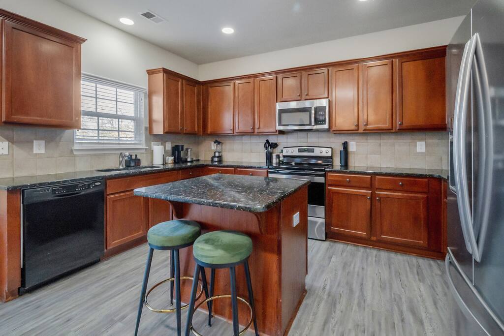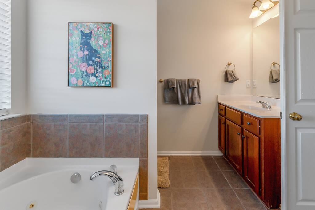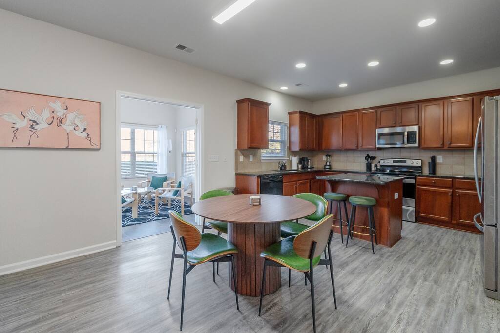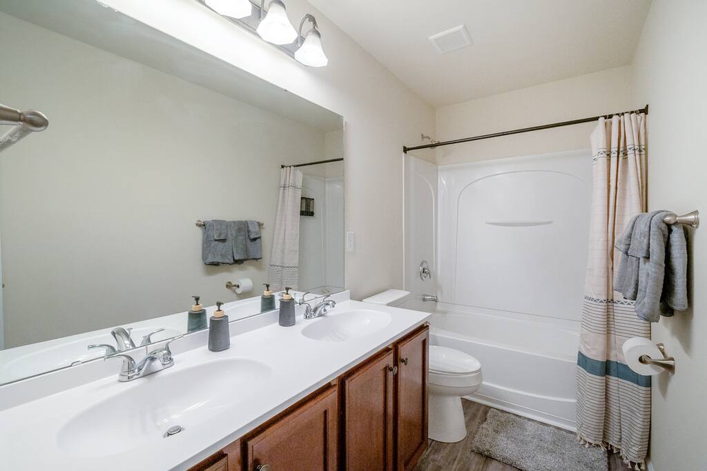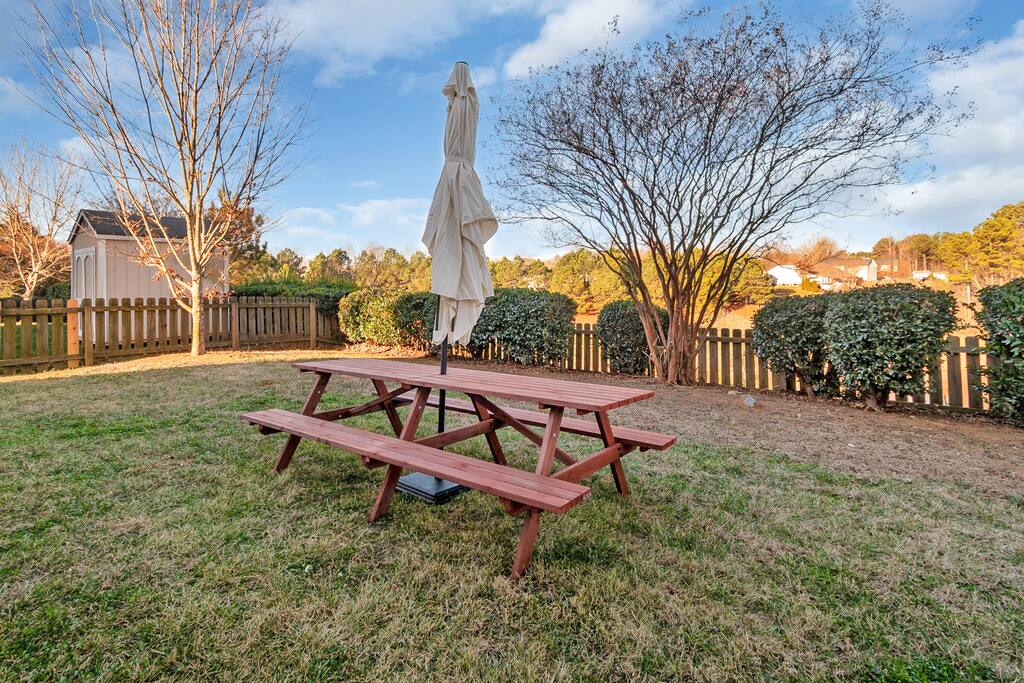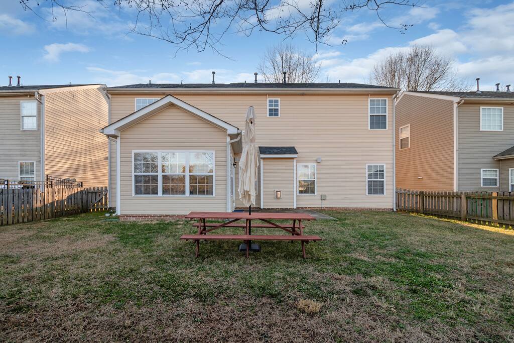 FAMILY ROOM: The Cozy Gathering Hub ✔ Gas fireplace for cozy nights in ✔ Board games for family fun & rainy days ✔ Plenty of seating + lounge chairs for group hangouts ✔ Large coffee table + side tables for snacks, drinks & laptop work ✔ Perfect for meals, game nights, or relaxing with the fire SUNROOM: Bright, Relaxing, & Versatile ✔ Surrounded by natural light ✔ Ideal for morning coffee, reading, remote work, or quiet calls ✔ Comfortable seating for small groups ✔ A favorite space for kids, grandparents, and early risers DINING ROOM: Group Meals & Celebrations ✔ Seats 8 guests comfortably with room to add extra chairs ✔ Ideal for family dinners, holiday meals, or team takeout nights ✔ Centrally located near the kitchen & living spaces ✔ Great for board games, puzzles, or work sessions when not in use for meals LIVING/MEDIA ROOM: Movies, Sports & Relaxation ✔ 65″ Smart TV for streaming movies, sports & shows ✔ Corner reading nook for quiet time or page-turners ✔ Cozy seating ideal for movie nights or binge-watching ✔ Great second living space for guests to spread out PRIMARY BEDROOM: Spacious King Suite ✔ King bed with premium linens ✔ Dedicated workspace for calls, laptops, & productivity ✔ Corner reading nook with natural light ✔ 50” Smart TV for streaming ✔ En suite bathroom featuring: - Walk-in shower - Whirlpool bathtub - Dual vanities - Walk-in closet SECOND BEDROOM: King + Reading Nook ✔ King bed ✔ Reading nook for relaxing wind-down time ✔ 50” Smart TV ✔ Generous storage & natural light THIRD BEDROOM: Bright King Room ✔ King bed ✔ 50” Smart TV ✔ Plenty of natural light (morning light is lovely here) FOURTH BEDROOM: Bunk Room w/ Personality ✔ Full-over-Full bunk bed + Twin trundle ✔ 50” Smart TV ✔ Quirky, playful decor ✔ Ideal for kids, cousins, siblings, or friend groups FIFTH BEDROOM: Flexible Bunk Space ✔ Full-over-Full bunk bed + Twin trundle ✔ 50” Smart TV ✔ Storage for longer stays BATHROOMS: Clean, Stocked & Functional ✔ 2.5 total bathrooms, including the primary ensuite ✔ Full hallway bathroom with shower/tub combo ✔ Main floor half bath for convenience ✔ Stocked with shampoo, conditioner & body wash ✔ Microfiber towels provided for every guest ✔ Hair dryer included KITCHEN & DINING ✔ Fully equipped kitchen (cookware, utensils, dinnerware) ✔ Nespresso machine w/ pods ✔ Air fryer, toaster, electric kettle ✔ Stainless appliances, nonstick pots and pans ✔ Dining table for groups ✔ Counter seating for casual meals TECH & CONNECTIVITY ✔ High-speed Wi-Fi (500Mbps+) ✔ Smart TVs in every bedroom + main living room ✔ Self check-in via smart lock OUTDOOR FEATURES ✔ Fenced backyard (private & secure) ✔ Picnic table for outdoor dining ✔ Perfect for kids, pets, and group hangouts LAUNDRY / PARKING ✔ Washer & dryer (detergent + dryer sheets provided) ✔ Free parking for up to 4 cars (garage + driveway) ✔ No overnight street parking allowed - HOA enforced; fines possible PETS ✔ Up to 2 dogs allowed ✔ $100 pet fee per stay ✔ Dogs must be house-trained, leashed outdoors, & not left unattended unless crated ✔ Guests must clean up after pets; damage/excess cleaning may incur charges IDEAL FOR ✔ Family trips & reunions ✔ Business & consulting travel ✔ Insurance displacement & ALE stays ✔ Relocations & extended stays ✔ Medical visits (Atrium / CaroMont nearby) LOCATION HIGHLIGHTS ✔ 5 min to Charlotte Premium Outlets (100+ stores) ✔ 9 min to Topgolf Charlotte Southwest ✔ 10 min to CLT Airport ✔ 15 min to Whitewater Center ✔ Near Lake Wylie, parks & trails ✔ Near dining, groceries, coffee & gyms ✔ Quick access to I-485 & I-77 NEARBY DINING & COFFEE ✔ Jim ’N Nick’s Bar-B-Q ✔ Enrico’s Ristorante & Pizzeria ✔ Steele Creek Cafe ✔ Starbucks / Dunkin’ ✔ Chick-fil-A / Panera / Chipotle NEARBY GROCERY & ESSENTIALS ✔ Publix ✔ Harris Teeter ✔ Walmart Supercenter ✔ Target HOUSE RULES & IMPORTANT NOTES ★ PETS ★ - Up to 2 dogs allowed - $100 pet fee per stay - Dogs must be leashed outdoors and not left unattended unless crated - Guest cleanup required; damage/excess cleaning may incur charges ★ NO SMOKING INSIDE ★ Smoking indoors is strictly prohibited. Evidence will result in odor & cleaning fees. ★ GATHERINGS & QUIET HOURS ★ - No parties or large events - Small gatherings are allowed (within guest count) - Must respect neighbors and home - Quiet hours: 10PM–8AM ★ PARKING & HOA RULES ★ - Driveway + garage parking for up to 4 vehicles - No overnight street parking (HOA enforced, fines possible) ★ SECURITY & SAFETY ★ - Smoke & CO detectors - Fire extinguisher & first-aid kit - Ring doorbell + exterior security cameras (entry-only; no interior)